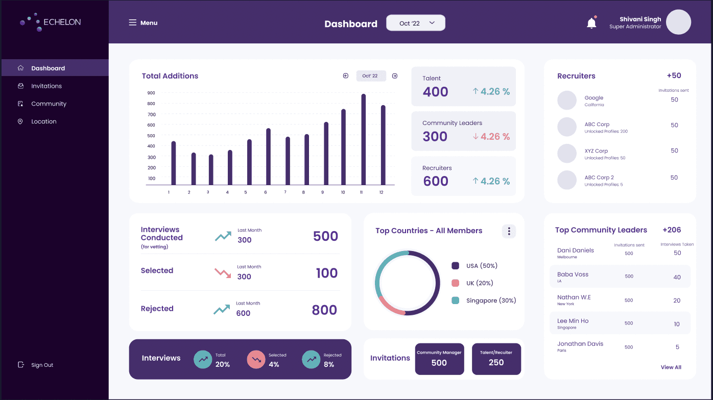 Streamlined Dashboard: Centralized view of platform activities and pending tasks, showcasing metrics like mentors, mentees, invitations, and assessments